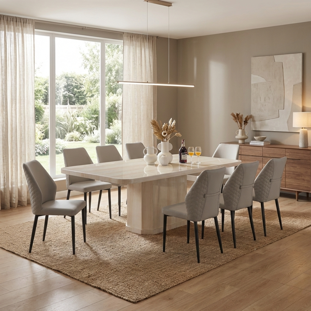 Soft Luxury Finish: The Velorum table features a stunning marble-effect surface in warm cream and beige tones with subtle, flowing striations. This lighter palette reflects light beautifully, making your dining area feel more spacious and inviting.