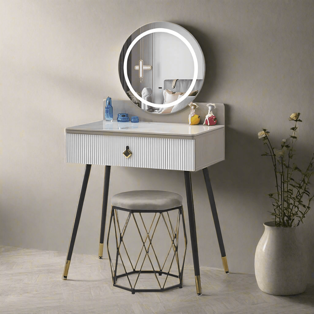 Experience elegance with the Vianna Sintered Stone Dressing Table, a sophisticated blend of modern design and functionality. The sintered stone tabletop offers durability and luxury, while the LED mirror provides soft illumination for a flawless beauty routine. With a minimalist design and a spacious single drawer, this dressing table is ideal for compact yet stylish spaces.
