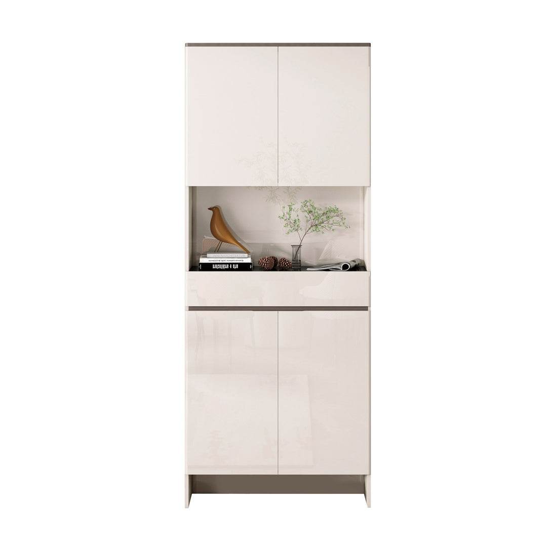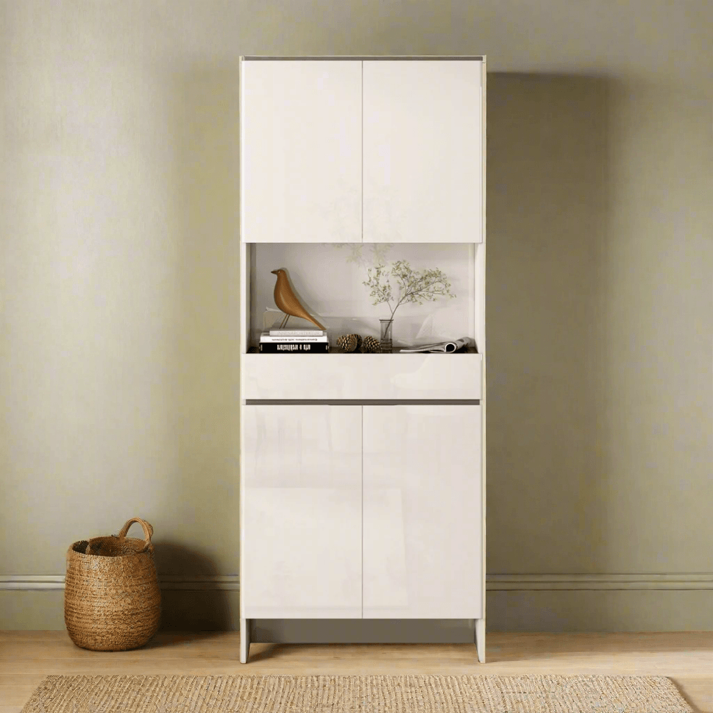 The Wavianne Tall White Shoe Cabinet (80cm) is expertly designed to fit perfectly in small areas. Its elegant off-white gloss finish effortlessly blends in with various contemporary styles. Featuring 4 doors and multiple shelves, this cabinet allows for efficient storage and quick access to frequently needed items and keys, while also including a drawer for additional organization and a clutter-free space.