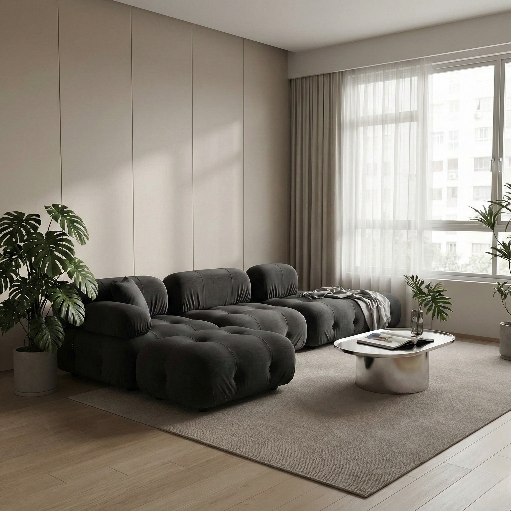 The Zyrenne Fabric Sectional Sofa is a sculptural modular piece designed for homes that value softness, flexibility, and bold contemporary design. Upholstered in premium lambswool fabric, Zyrenne delivers a plush, textured surface with a cozy matte finish that instantly warms any living space. Its low-profile, cloud-inspired silhouette and deep tufted cushions create a relaxed yet high-end statement perfect for modern interiors.
